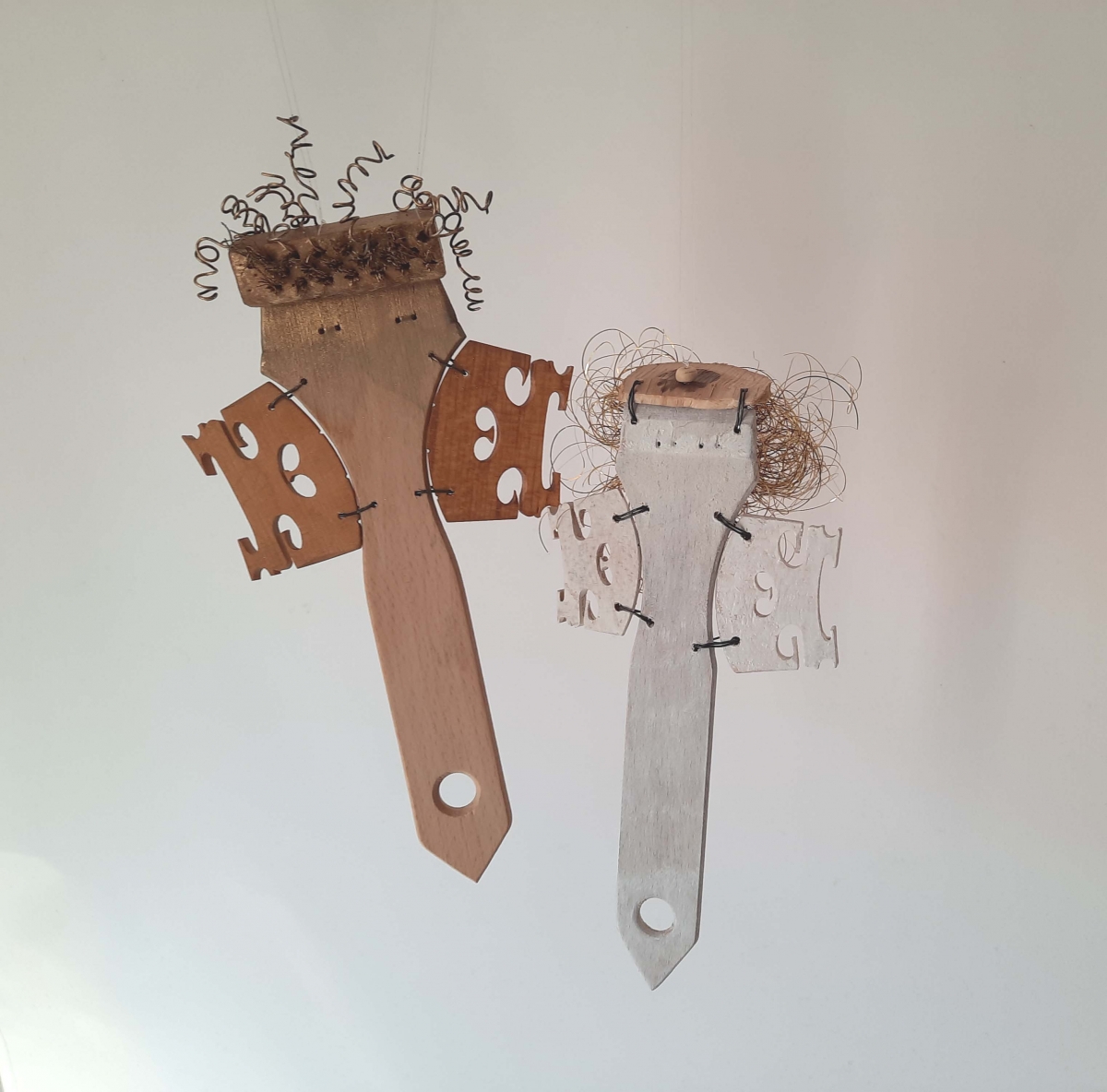 Von einer Geigenbau-Meisterin werde ich regelmäßig mit Material wie Kinnhalter, Wirbel, Feinstimmer aus Metall usw. versorgt. So werden z.B. die schönen Formen der Ebenholz-Saitenhalter zu Engelkörpern...