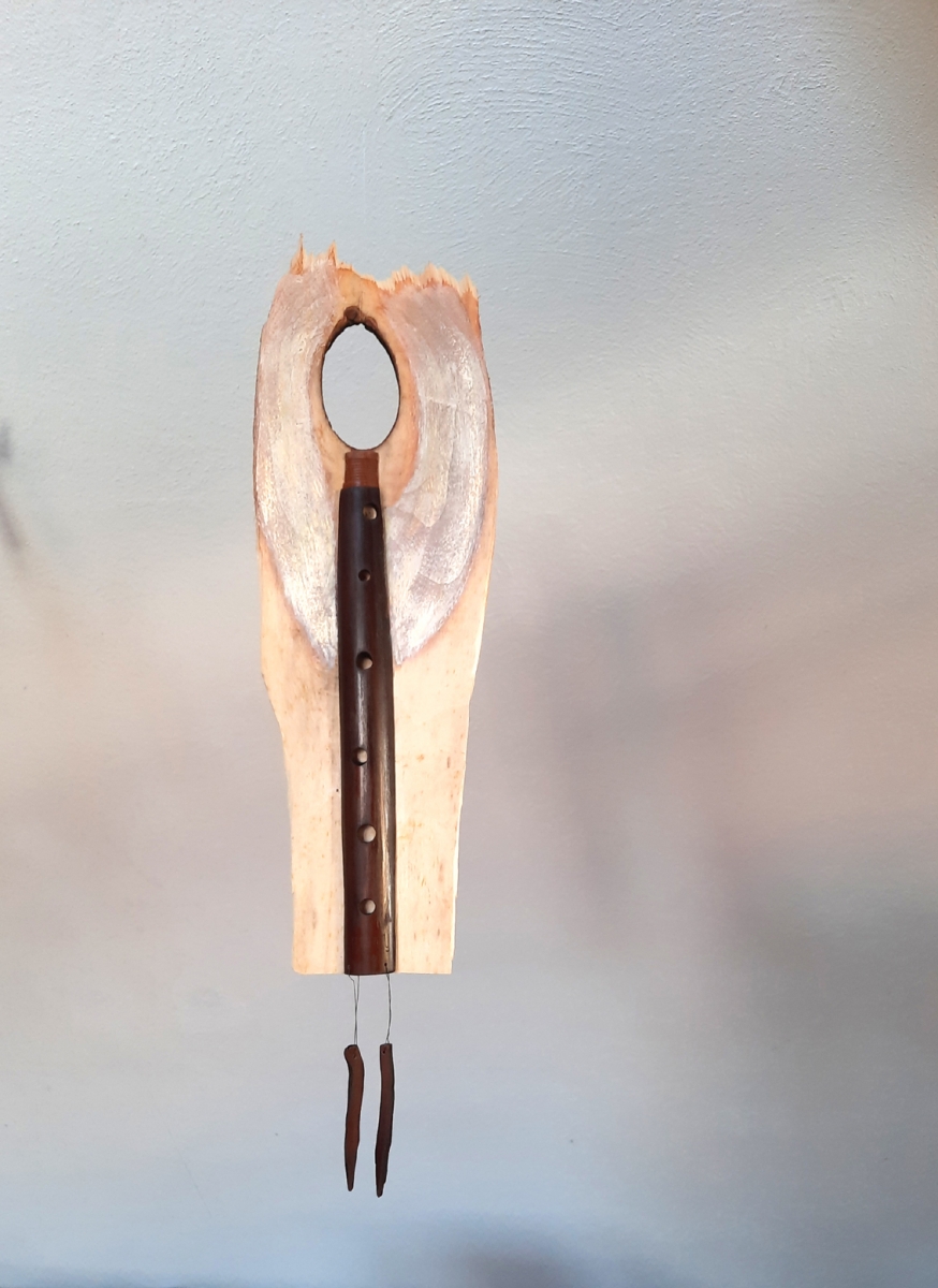 Auch eine ausgediente Bassflöte wird z.B. mit teilweise unbrauchbar gewordenen Querflötenklappen als Kopfhörer bzw. Mikro zur „Band“ und das Endstück einer Altflöte entwickelt sich zum Flötenengel mit Kopfhörer und Flügeln aus Trommelhaut…!